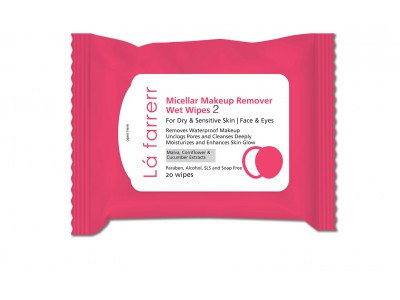 دستمال مرطوب آرایش پاک کن مخصوص پوست‌های خشک و حساس لافارر علاوه بر برطرف نمودن کامل آرایش، با توجه به ترکیبات مؤثری که در آن به کار رفته، رطوبت از دست رفته پوست را بازگردانده و موجب افزایش لطافت و شادابی پوست با کاهش علائم حساسیتی آن می¬شود. این دستمال مرطوب فاقد اسانس، پارابن، اتانول، SLS و مواد صابونی می¬باشد تا هیچ گونه حساسیتی از جانب این مواد به پوست تحمیل نشود.