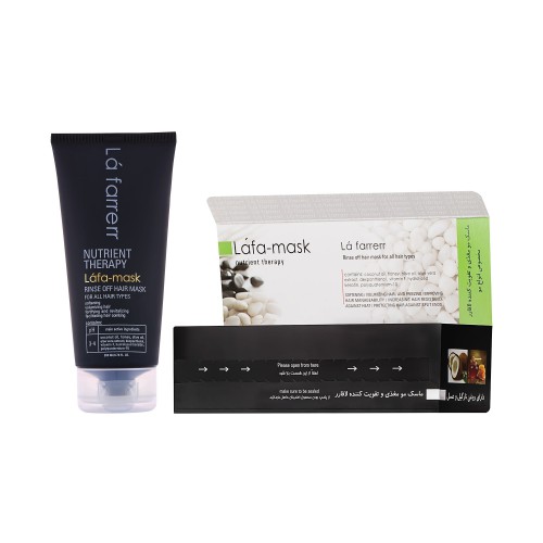ماسک مو مغذی و تقویت کننده انواع مو لافارر حاوی روغن نارگیل، عسل، کراتین هیدرولیز شده، روغن زیتون، عصاره آلوئهورا و ویتامین F میباشد که موجب لَخت کنندگی سریع، افزایش استحکام ساقه مو،نرم کنندگی موثر و افزایش خاصیت ارتجاعی مو میگردد.